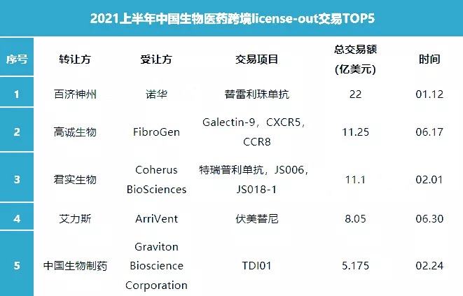 目前,中国制药企业License-in进海外品种已经很多了,尤其是再鼎医药将License-in模式系统化以后,这一类合作已经数量众多。同时,伴随着中国医药企业研发创新实力不断提升,License-out案例和金额也在增加。据不完全统计,2021上半年中国生物制药跨境license-out交易超20笔,披露出交易金额的项目交易额均在1亿美元及以上。