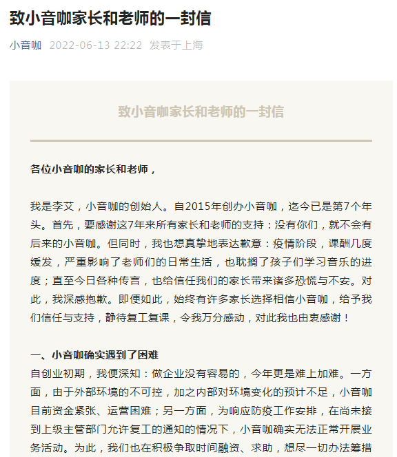 近日,小音咖创始人李艾在官方公众号发出一封《致小音咖家长和老师的一封信》,信中提到由于疫情严重影响了小音咖的正常营业,目前老师的课酬缓发,资金紧张、运营困难,正在积极争取时间融资、求助,并制定了“纾困计划”,承诺“尽力保障愿意接受复课且新增耗课老师的课酬先以打折的方式支付,剩余部分分期进行支付”,同时希望家长“暂缓退费”。
